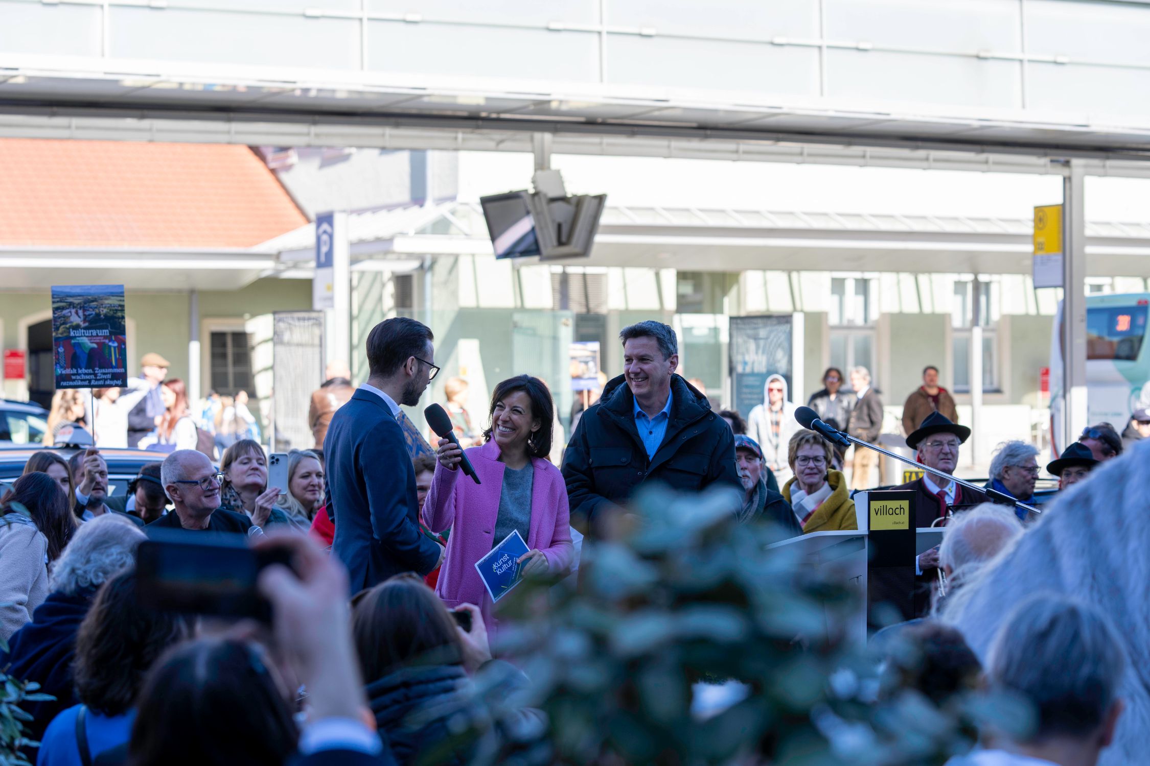 Ihren Höhepunkt erreichte die Premierenfahrt im Endbahnhof Villach. Dort wurden die Gäste von der Jauntaler Trachtenkapelle musikalisch empfangen. Gemeinsam mit der Kapelle zogen sie in einer Plakatkarawane der Kärntner Kulturevents bis zum Bahnhofsvorplatz, wo bereits die Stadtkapelle des Eisenbahnmusikvereins wartete.
